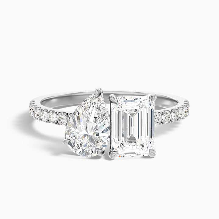 Ainsy 3 carat pear and emerald toi et moi pave ring in lab grown diamond is an elegant toi et moi engagement ring crafted in 14k rose gold. The tone of band perfectly complements the two sparkling stones, with a total carat weight of 3 carat that ensures exceptional brilliance.