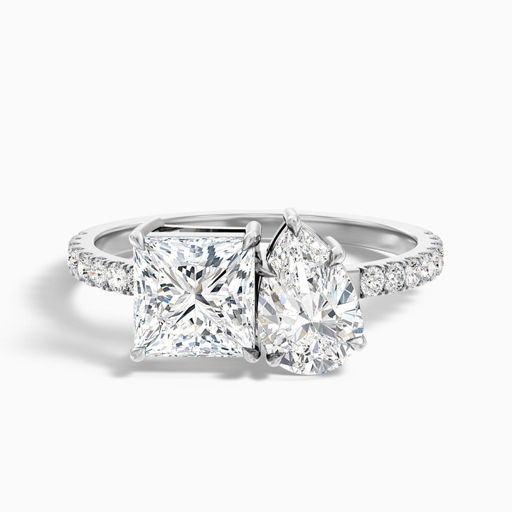 Anyla 1.5 carat princess and pear two stone toi et moi pave ring in moissanite diamond is a dazzling toi et moi ring crafted in 10k white gold. With a sleek and polished finish, the band setting enhances the brilliance of its stones. Featuring a total carat weight of 1.5 carat, this toi et moi diamond ring is designed to captivate.