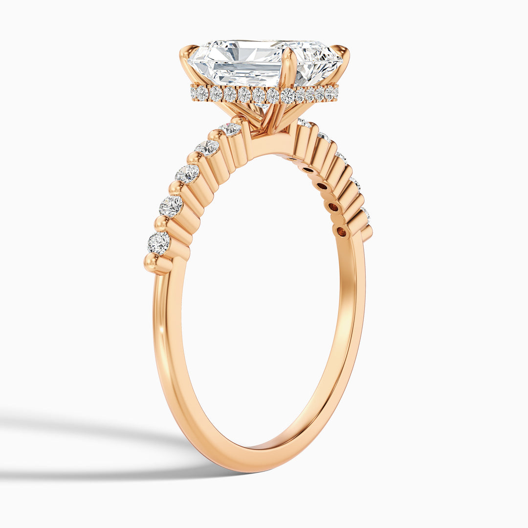 With its simple shape and extra sparkle, the arlen radiant with side stone hidden halo lab grown diamond ring stands out without being too bold. A 3.5 carat lab grown diamond is placed in the center, with hidden stones just under the top. These small diamonds catch the light from the side, creating a soft shine that appears when you move.