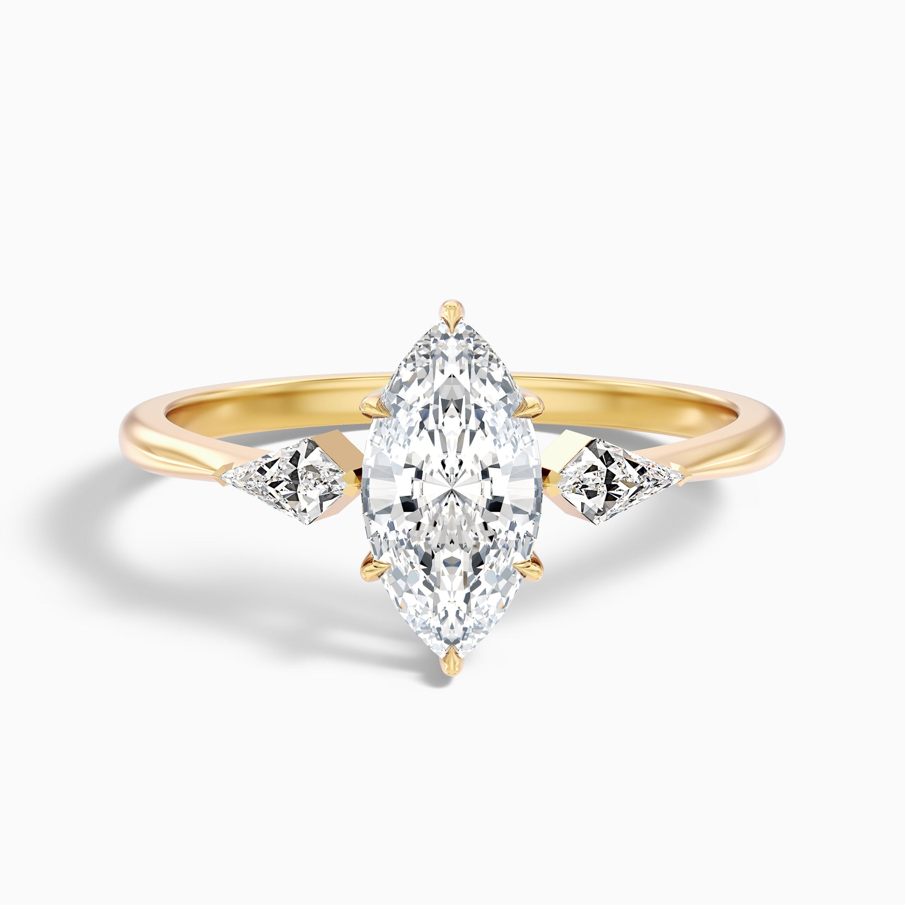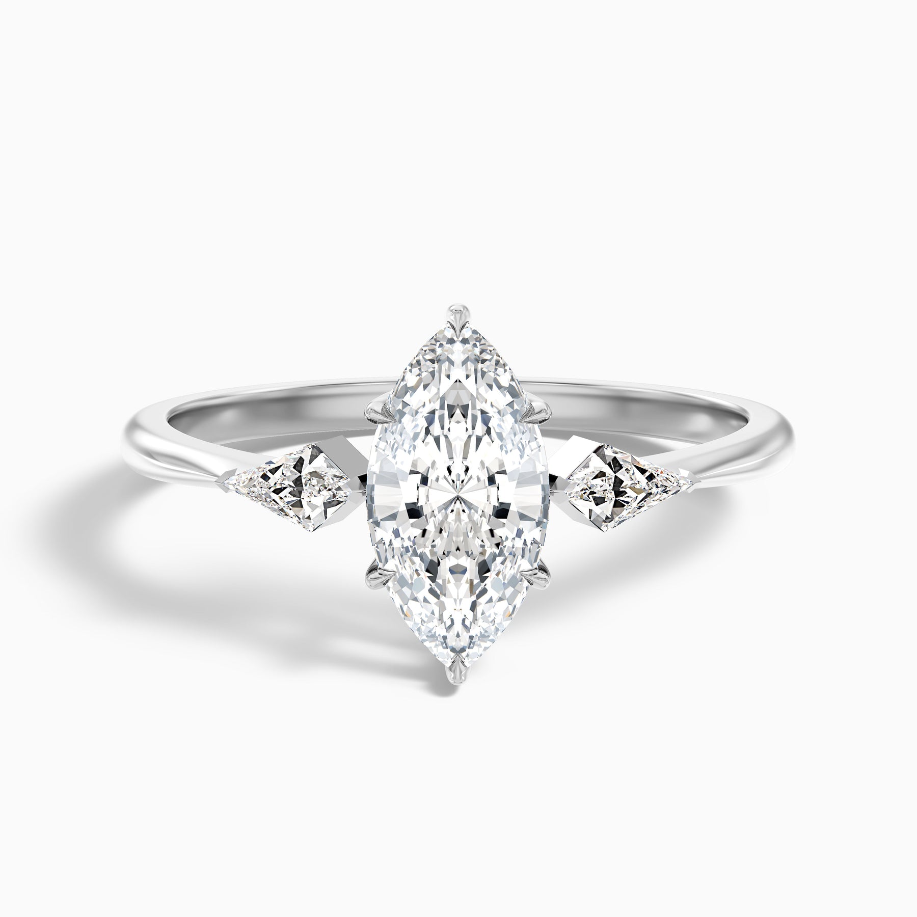 The brona marquise cut side kite cut lab grown diamond ring is a graceful symbol of commitment, featuring a center diamond flanked by two smaller stones. The combined 2 Carat weight offers impressive brilliance, while the sturdy 925 sterling silver setting guarantees lasting beauty.