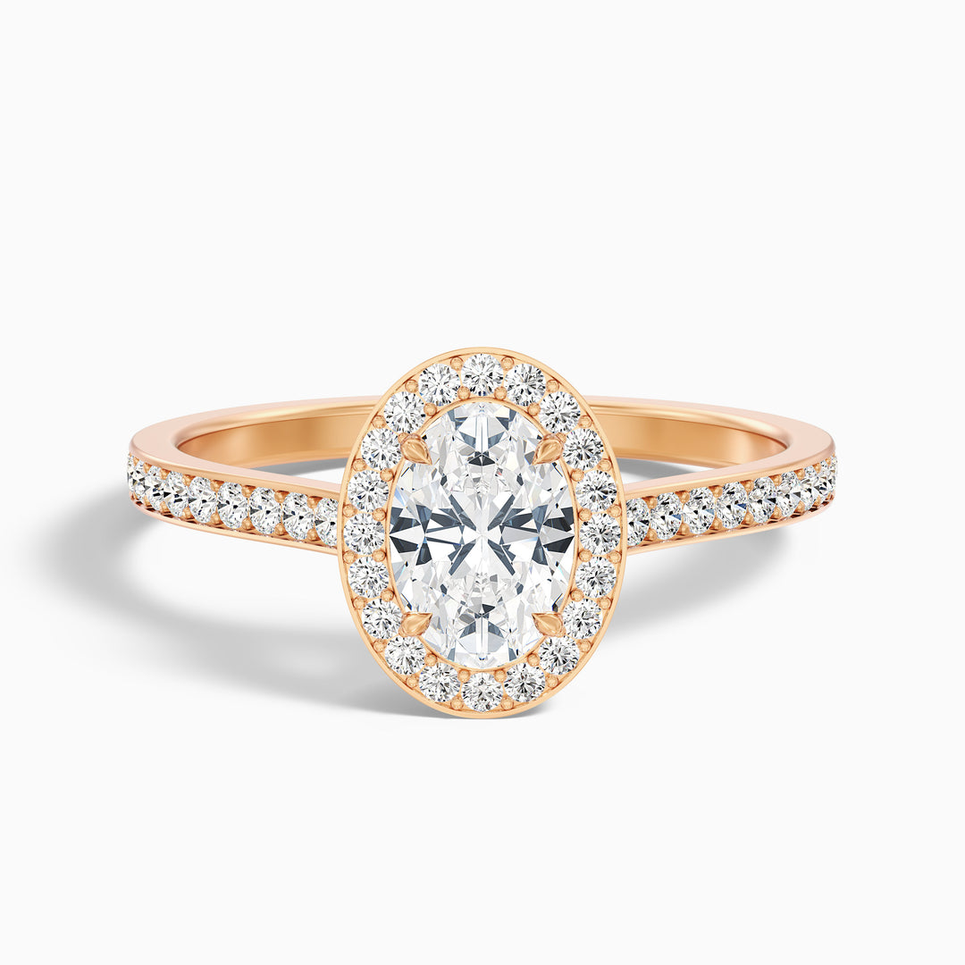 Fall in love with the erin 5 carat oval halo pave lab grown engagement ring. It features a dazzling 5 carat lab grown diamond, surrounded by a halo for extra sparkle. The diamond is cut to enhance its brilliance, making it a standout piece. Crafted in 18k yellow gold, the ring offers both beauty and strength, perfect for everyday wear.