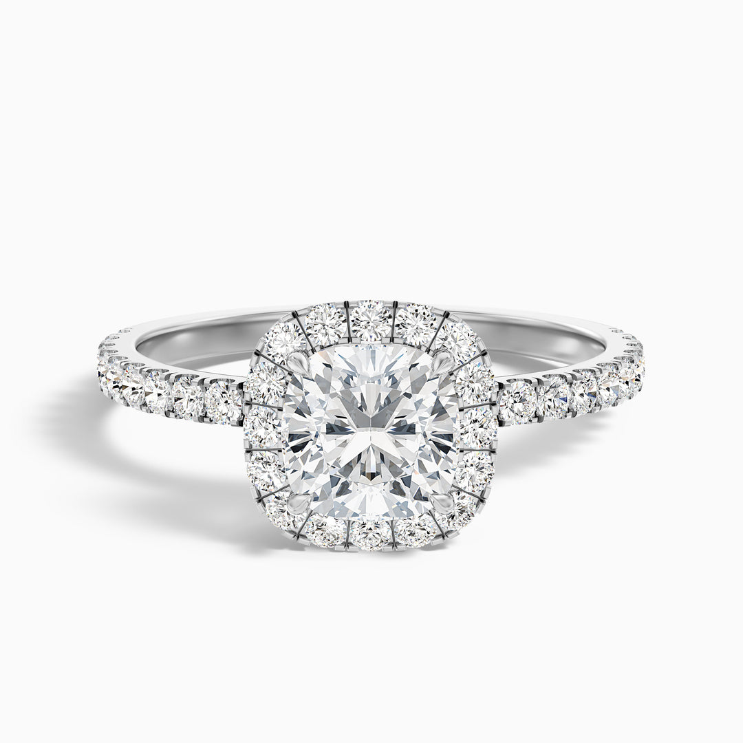 Bring on the bling with our gina 4.5 carat cushion cut halo pave moissanite engagement ringwith its 4.5 carat moissanite diamond set in a halo, it is sure to turn heads. The diamond's sparkle is enhanced by the halo design, creating a mesmerizing effect.