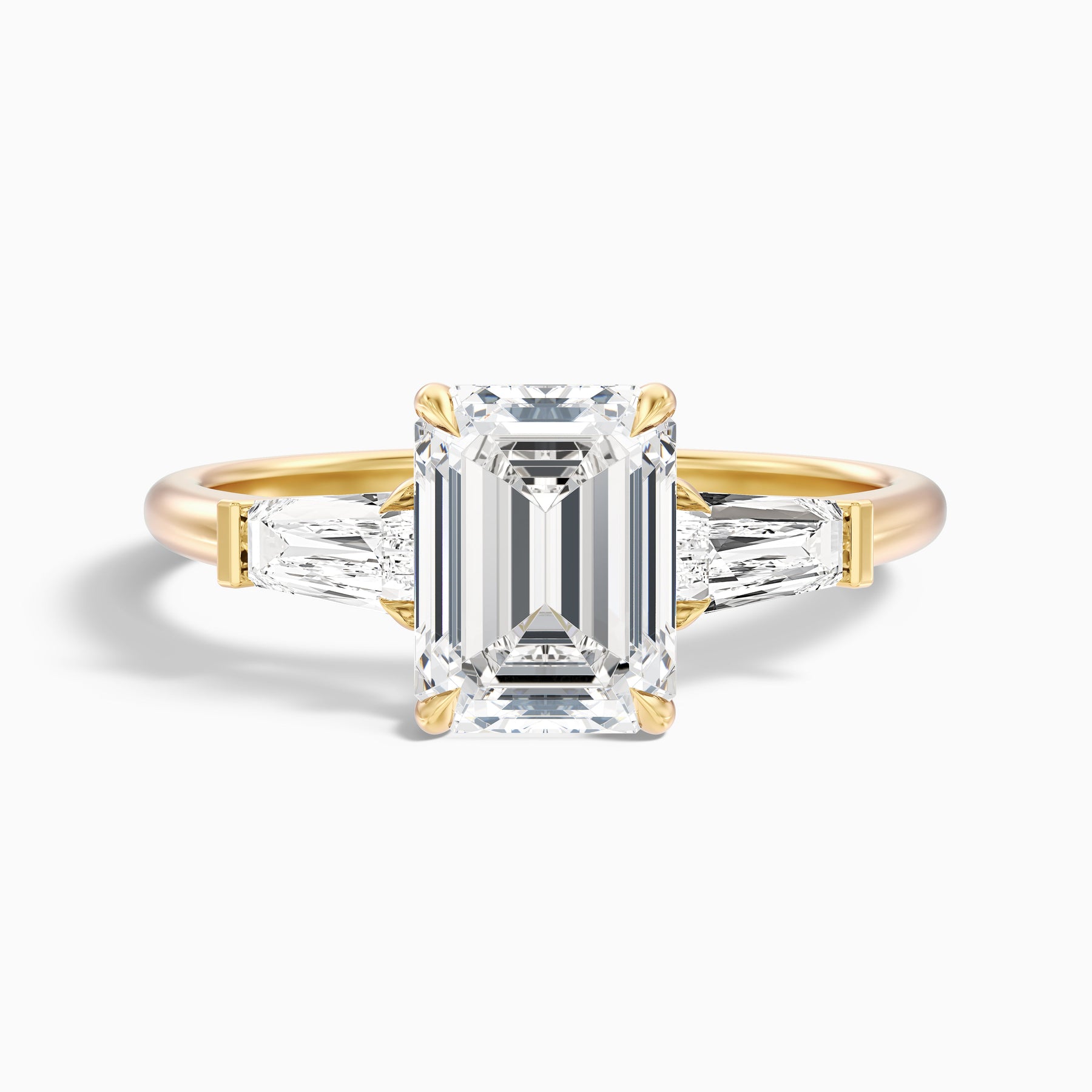 A refined 1 carat emerald cut moissanite sits between sleek baguette side stones in this elegant three stone ring. The rich 18k white gold setting enhances brilliance with a premium polished finish.