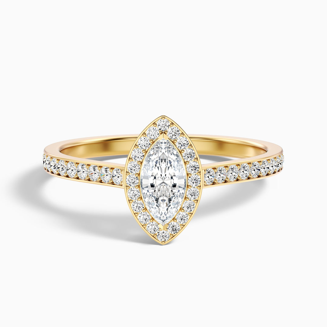 Impress your loved one with the ila 1 carat marquise halo pave moissanite engagement ring featuring a 1 carat moissanite diamond set in a halo, it's a true masterpiece. The diamond's brilliance is enhanced by the halo design, creating a mesmerizing effect.