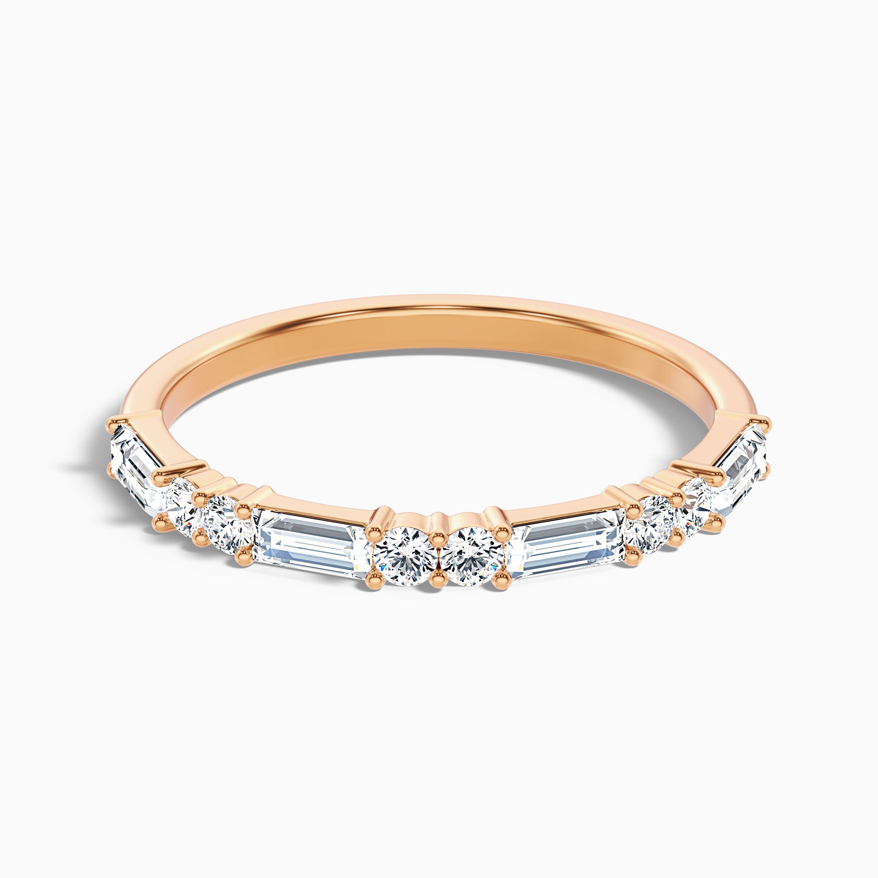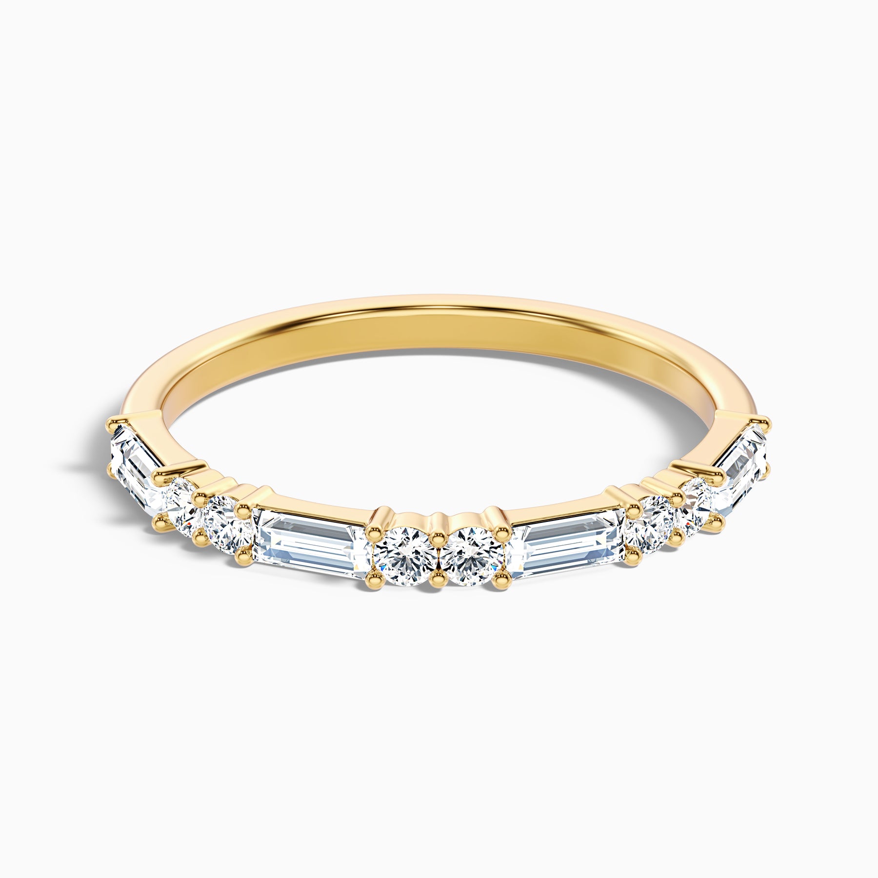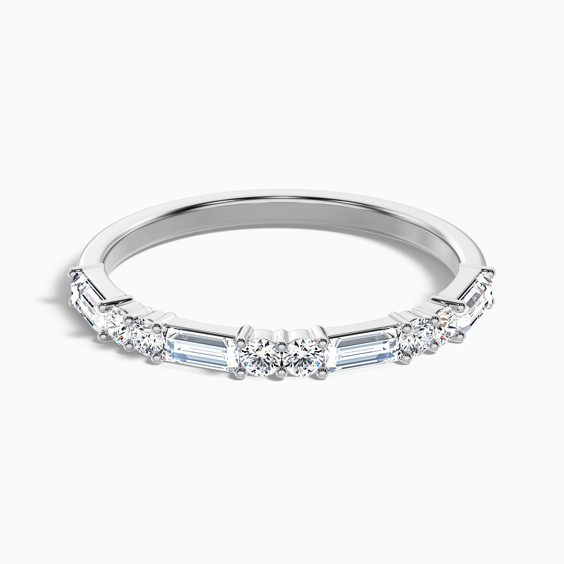 The Isleen Baguette and Round Cut Half Eternity Lab Grown Diamond Wedding Band combines baguette and round diamonds in a sleek half eternity design. Available in two variations, each 2 mm band offers sparkling brilliance in a shared prong setting. Perfect as a wedding band, anniversary ring, or stackable piece, it blends modern elegance with sustainable, ethically sourced diamonds.