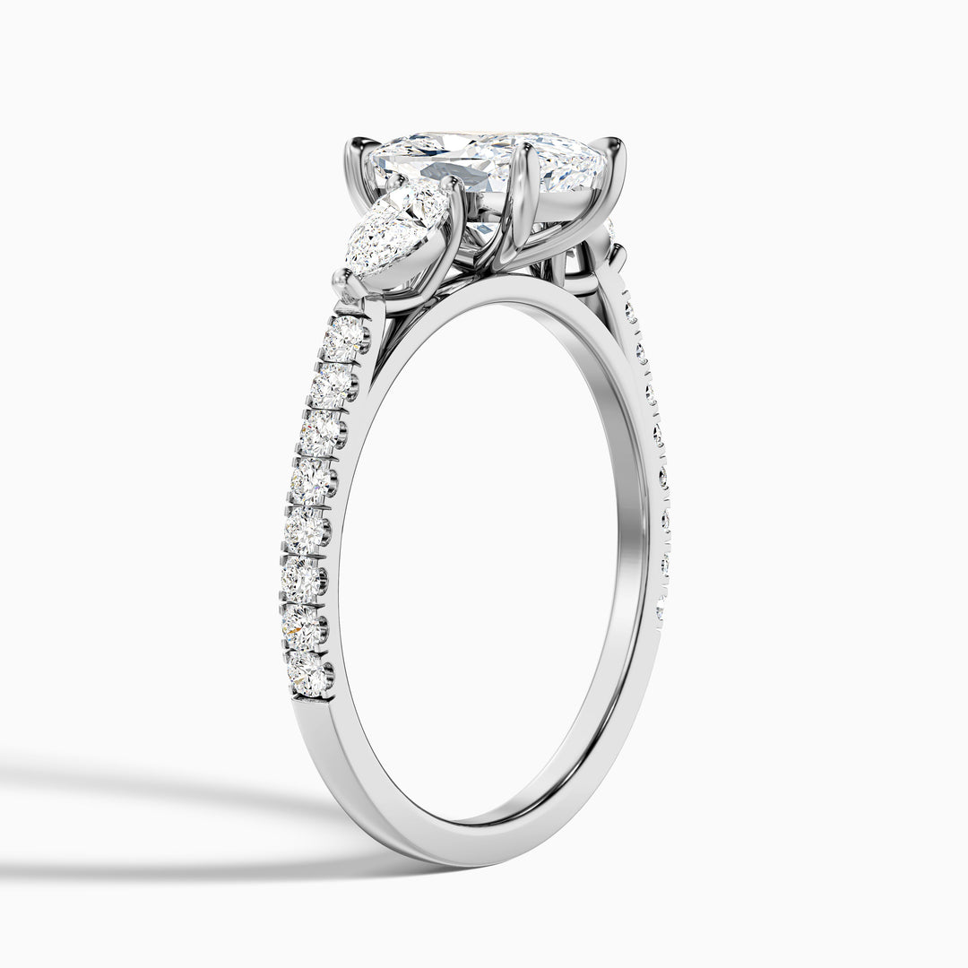 Ivana 2.5 Carat Three Stone Pave Ring with Pear Side Stones and an Elongated Cushion Moissanite Diamond in 18k White Gold