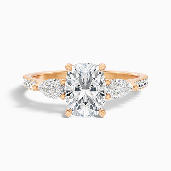 The ivana three stone pave ring with pear side stones and an elongated cushion moissanite diamond ring brings classic charm with a fresh perspective. Three sparkling diamonds take center stage, representing love, loyalty, and lasting memories. Their total 4.5 carat weight is carefully selected to provide radiant brilliance without compromising on comfort.