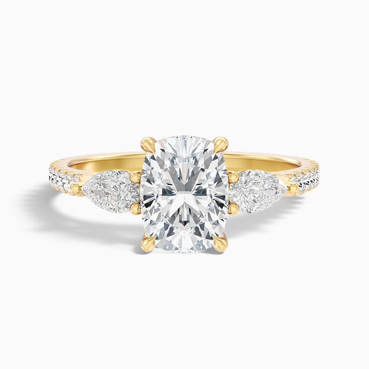 Celebrate your commitment with the elegant ivana three stone pave ring with pear side stones and an elongated cushion moissanite diamond ring. Its three brilliant diamonds, balanced in total 5.5 carat weight, symbolize your love’s past, present, and future.