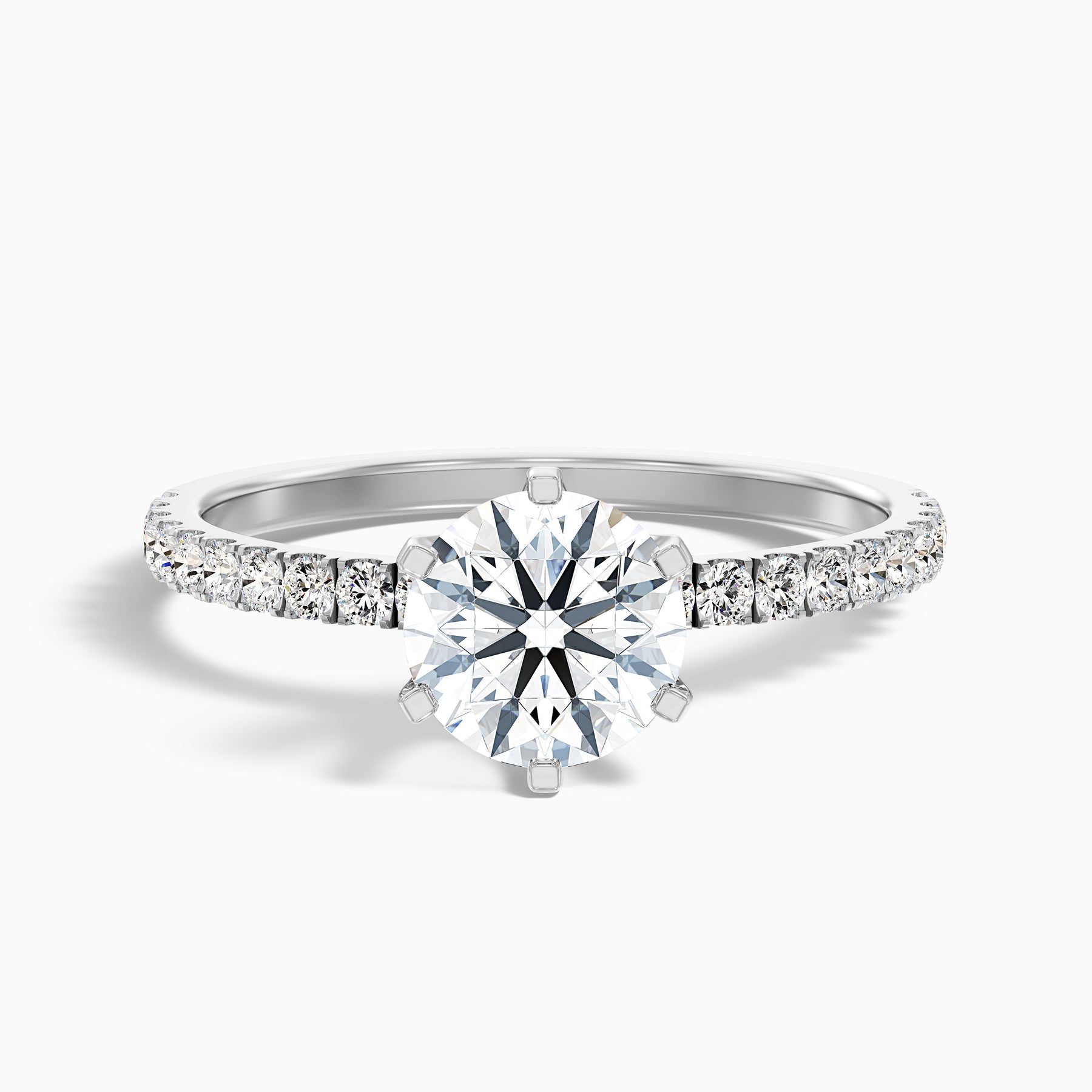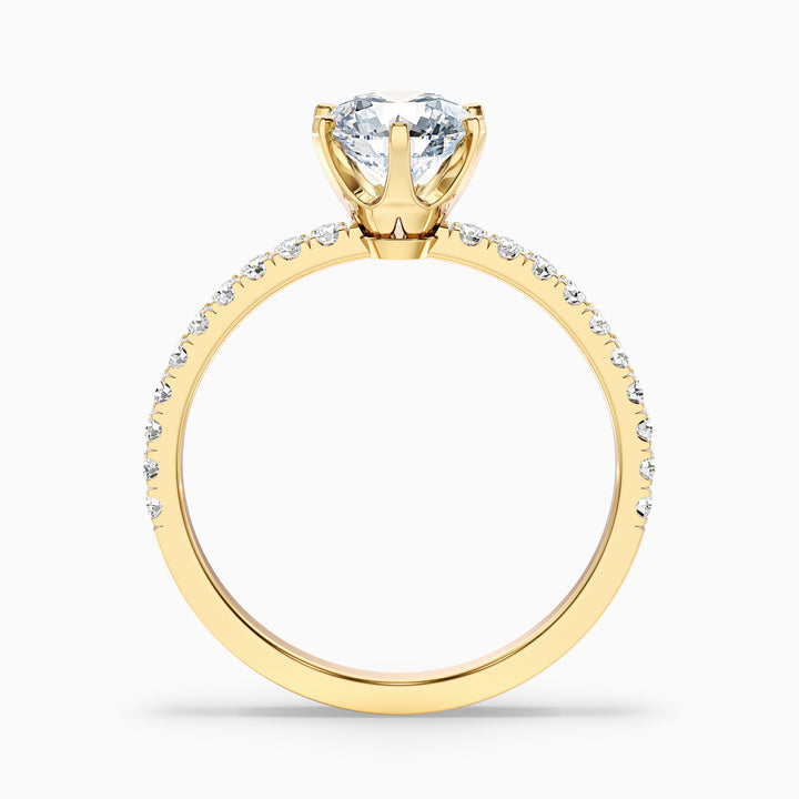 Add a touch of elegance to your engagement with the lyra 3 carat round side stone pave moissanite ring. It showcases a 3 carat moissanite diamond in a classic side stone setting. Made from 18k yellow gold, the ring is both stylish and sturdy.