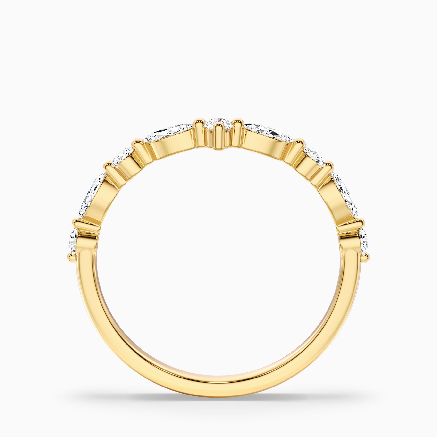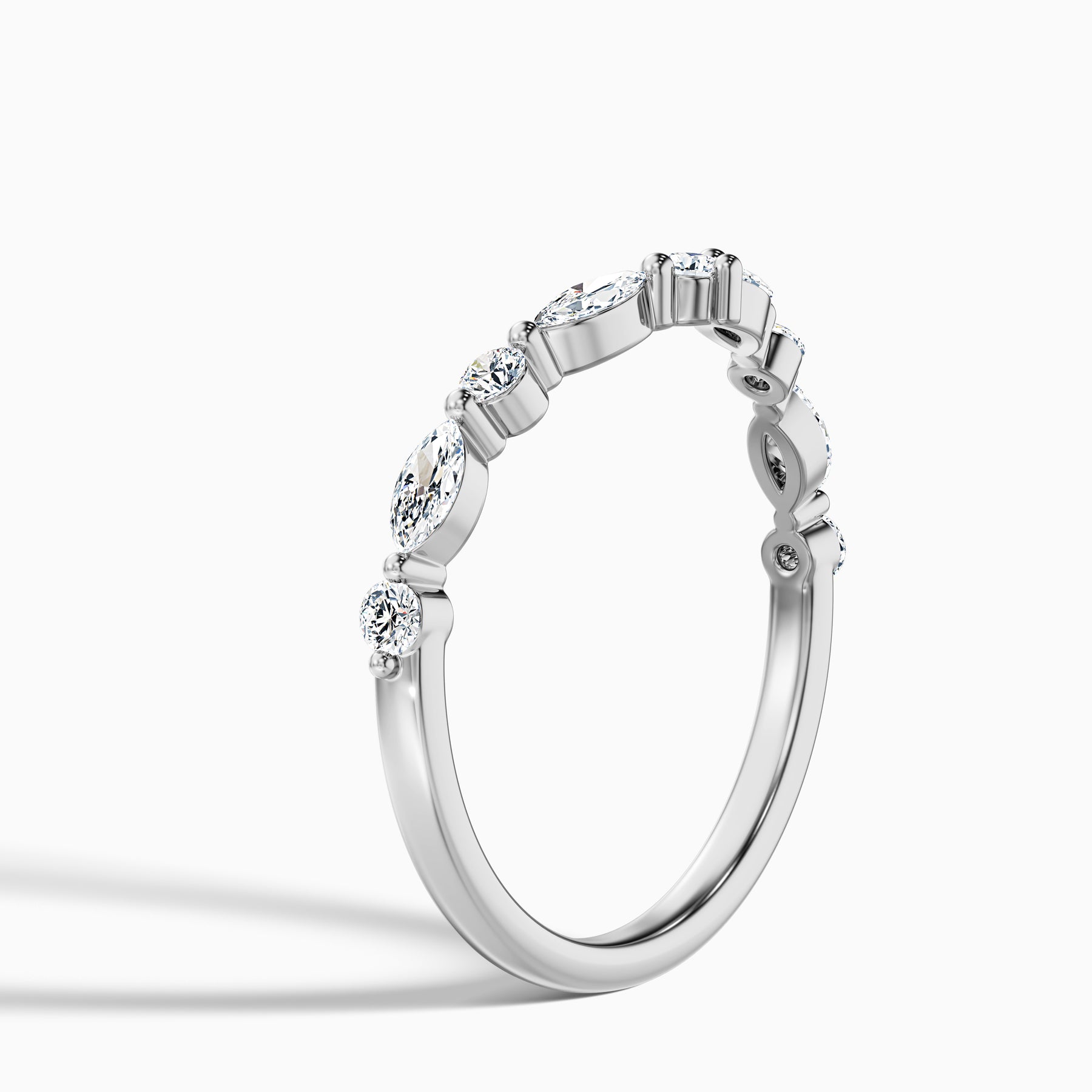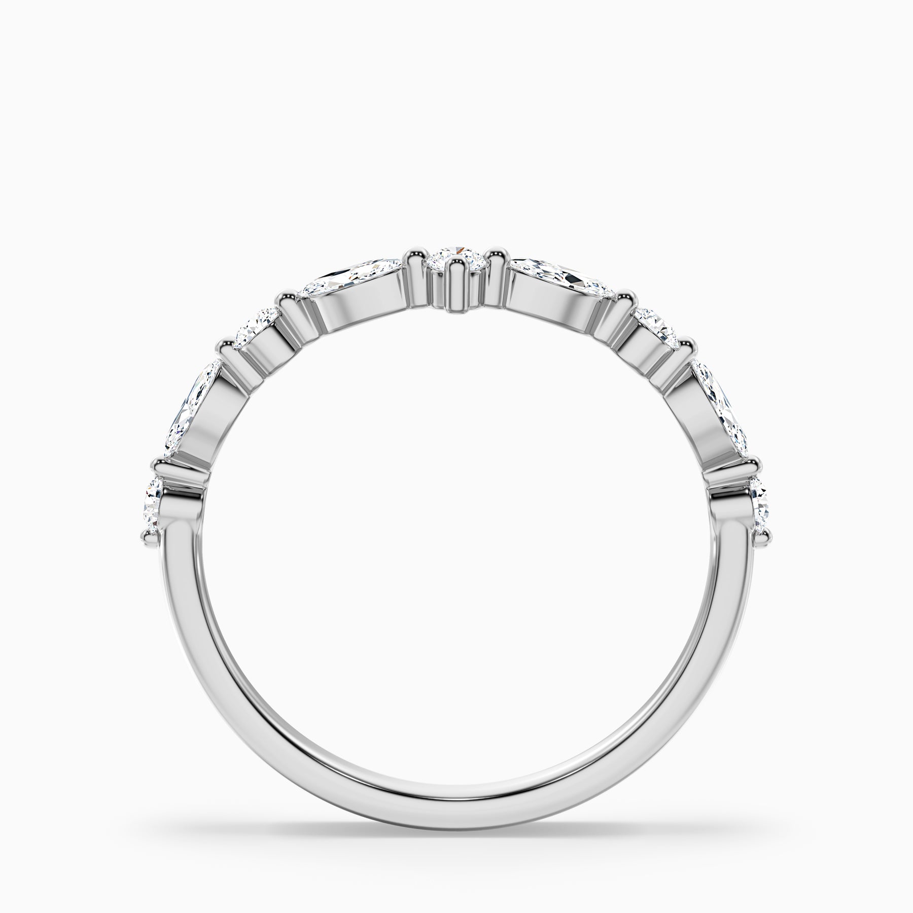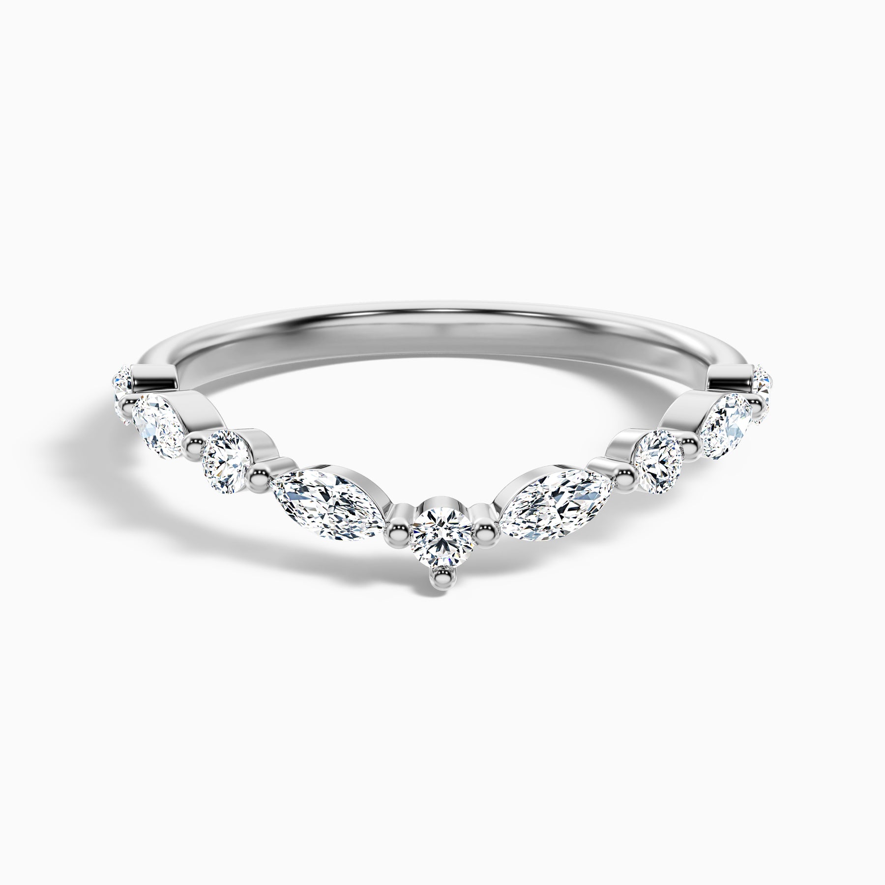 The Maelis Round and Marquise Cut Curved Lab Grown Diamond Wedding Band features elegant round and marquise diamonds in a shared prong setting. Available in 1.5 mm and 1.8 mm widths with rhodium plating, this curved band delivers refined sparkle and a comfortable fit. Perfect as a wedding band, anniversary ring, or stacking piece, it combines modern design with sustainable luxury.