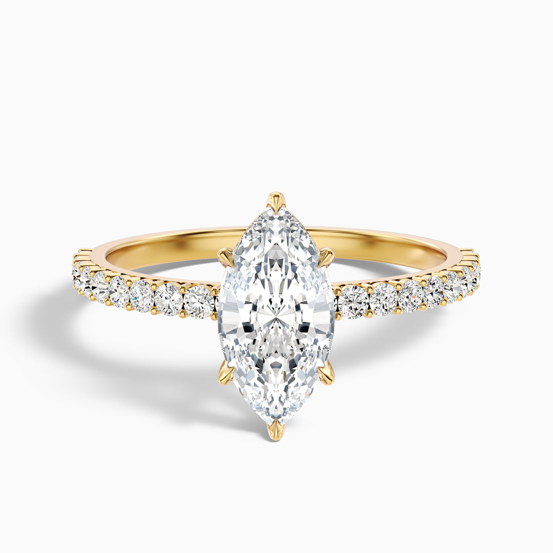 Elegance meets subtlety in the naomi marquise side stone moissanite engagement ring. A breathtaking 5 carat marquise diamond is the focal point, but the true charm lies in the hidden side stones beneath the setting. These small yet radiant diamonds add a secret shimmer visible only at certain angles, making this ring uniquely enchanting. The 10k rose gold band enhances its beauty with a smooth and polished finish, offering both durability and sophistication.