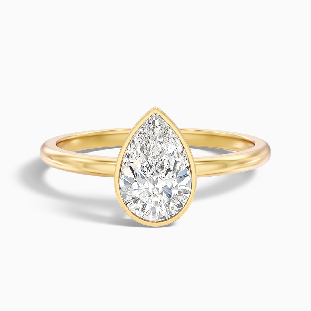 A perfect fusion of style and security, the nasya pear cut bezel set moissanite diamond ring features a dazzling 1.5 carat pear cut diamond set in a protective bezel setting. This setting encircles the diamond, keeping it safe from chips and scratches while enhancing its natural brilliance. The 10k rose gold band adds a refined touch, making this ring a stunning everyday piece.