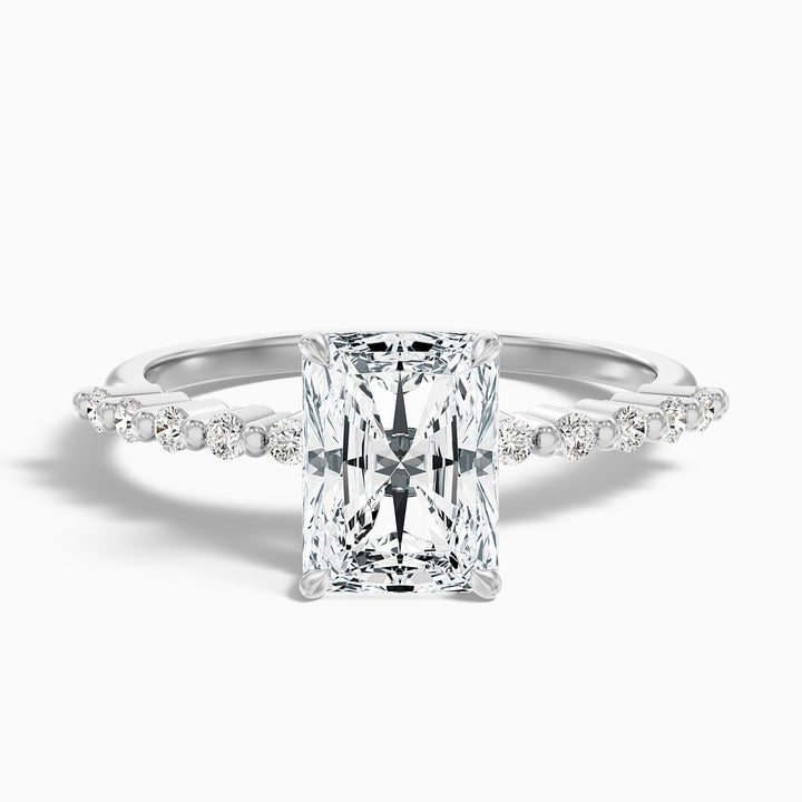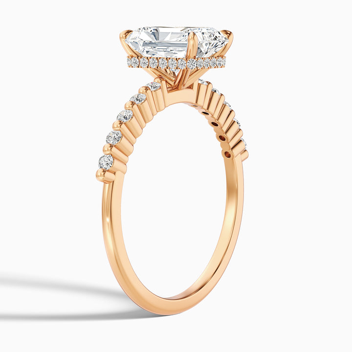 With the willy radiant with side stone hidden halo moissanite diamond ring, less is more. A 3 carat moissanite diamond sits in the center, lifted by a setting that hides a small circle of stones underneath. These stones reflect the light in a subtle way, without making the ring feel busy.