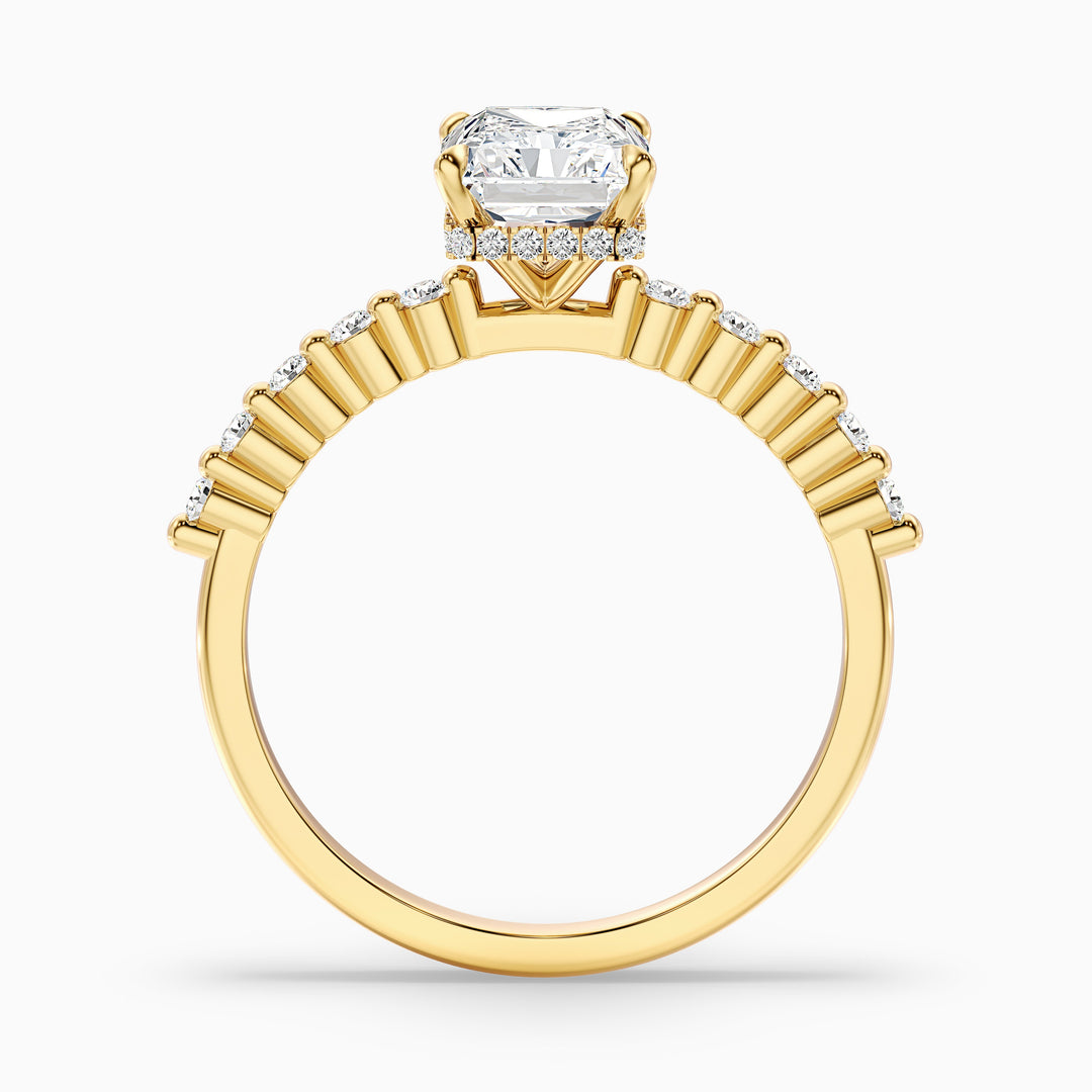The willy radiant with side stone hidden halo moissanite diamond ring is built for someone who enjoys a clean, open design with a little added detail. A 4.5 carat moissanite diamond sits in the center, with a subtle circle of stones hidden just beneath it.