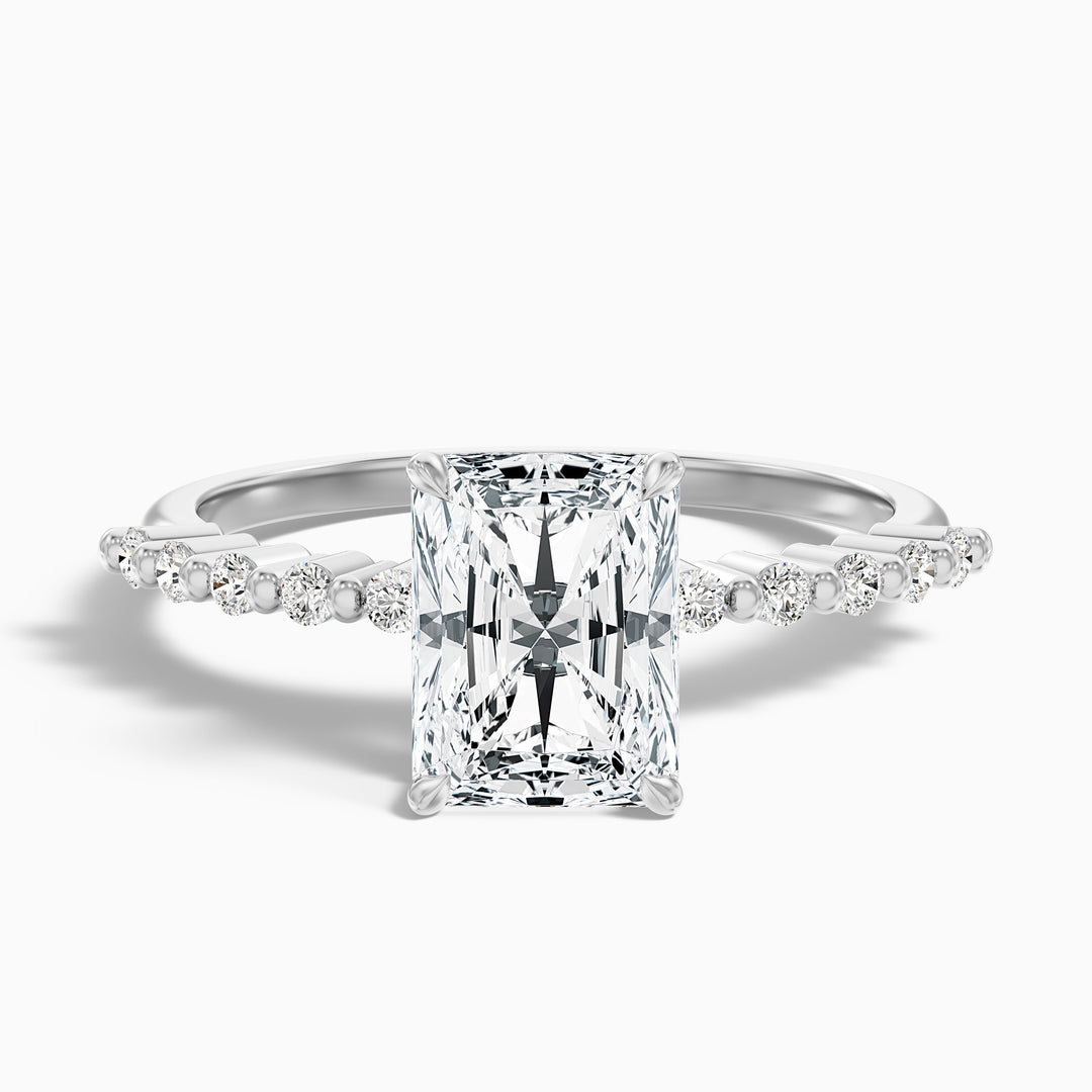 With its simple shape and extra sparkle, the willy radiant with side stone hidden halo moissanite diamond ring stands out without being too bold. A 5.5 carat moissanite diamond is placed in the center, with hidden stones just under the top. These small diamonds catch the light from the side, creating a soft shine that appears when you move.