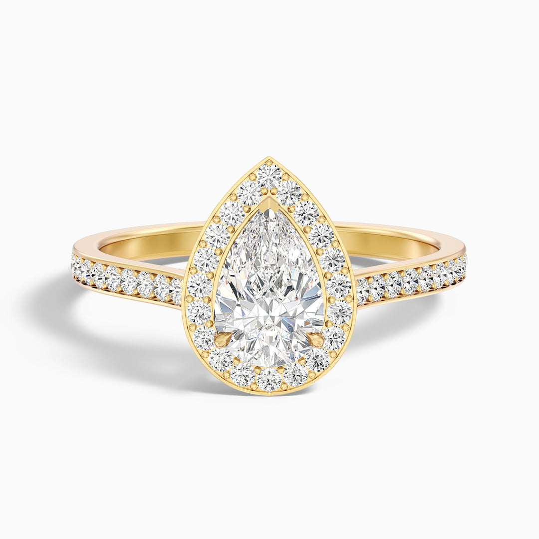 Wow your loved one with the elena 4 carat pear halo pave lab grown engagement ring. It showcases a stunning 4 carat lab grown diamond, surrounded by a halo of sparkle that enhances its beauty. The diamond's brilliance is maximized, making it a true showstopper.
